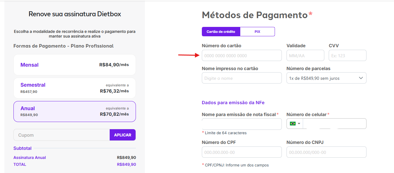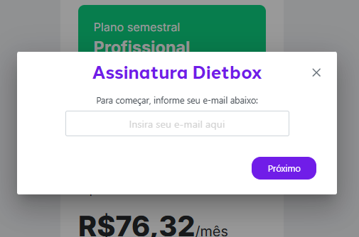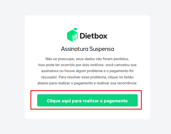 Se sua assinatura estiver expirada, você irá realizar o login no Dietbox > Clique aqui para realizar o pagamento, você será direcionado(a) à página de pagamento.