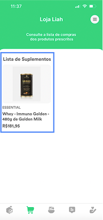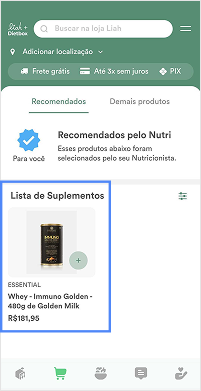 Na mesma aba, o paciente vê primeiro a seção Recomendados pelo Nutri, com os produtos indicados. Além das informações básicas, é possível comprar com condições especiais, graças à parceria entre a Dietbox e a curadoria da Liah.
