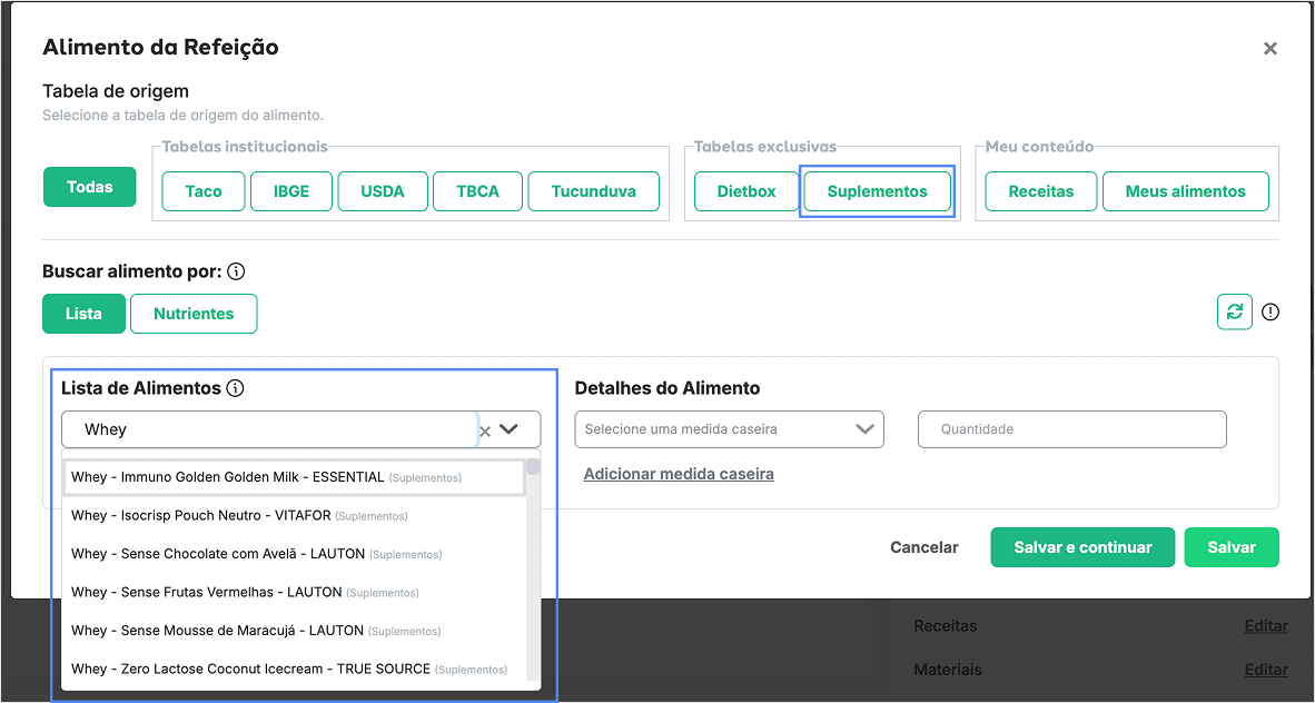 Ao incluir um alimento, pesquise pelo suplemento desejado. Se necessário, adicione equivalentes para oferecer mais variedade ao paciente.