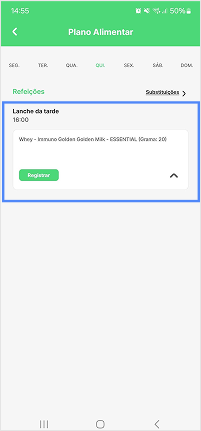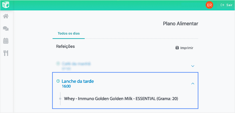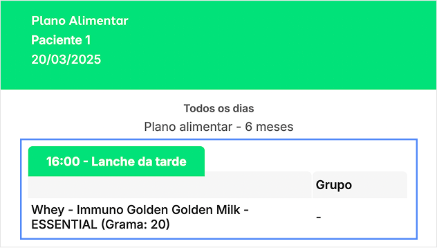 Ao montar o Plano Alimentar, quando o profissional adiciona um suplemento com marca pela Lista de Alimentos ou pela opção Adicionar Substituição, esse item é incluído no plano do paciente. Além disso, o sistema gera automaticamente uma Lista de Suplementos, com todos os produtos recomendados durante esse planejamento.
