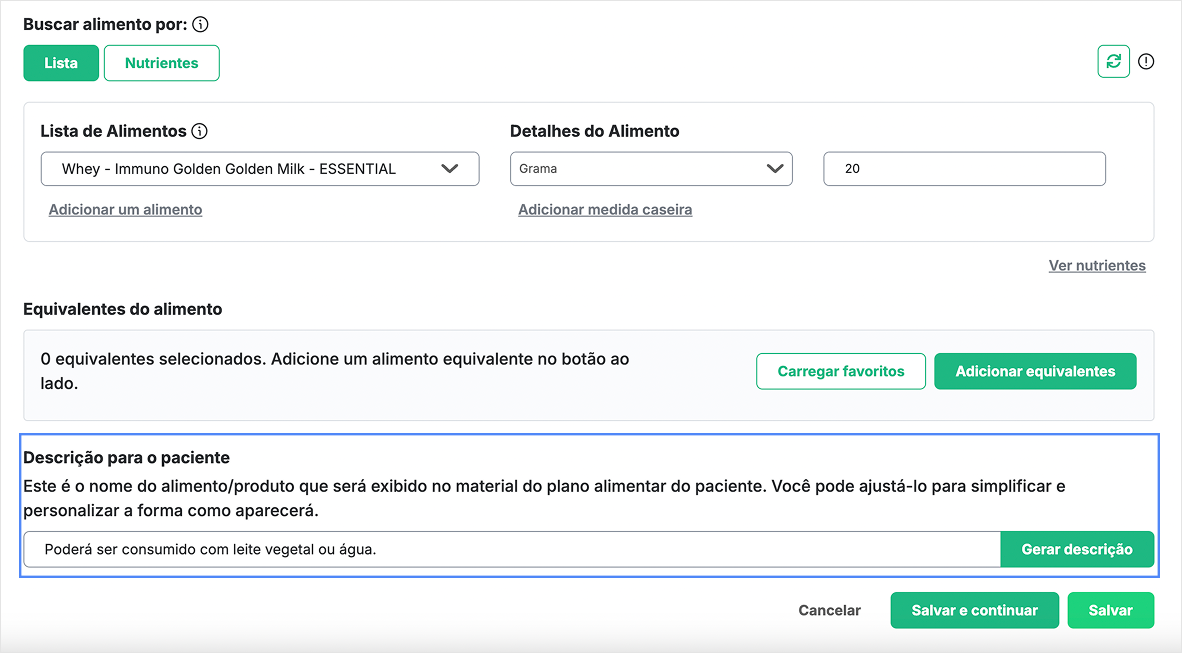 A área de Descrição para o paciente, no Dietbox, permite personalizar como alimentos e suplementos são apresentados. Isso melhora a compreensão da prescrição, reduz dúvidas e aumenta a adesão ao tratamento.