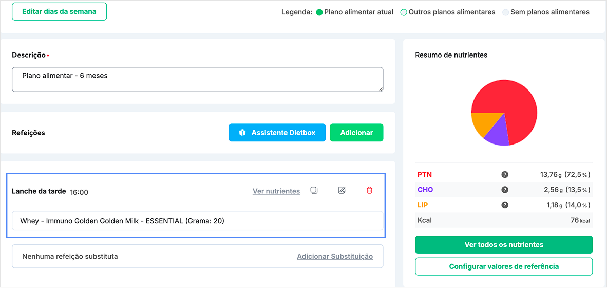 - No perfil do paciente, acesse o Plano Alimentar e adicione uma refeição.