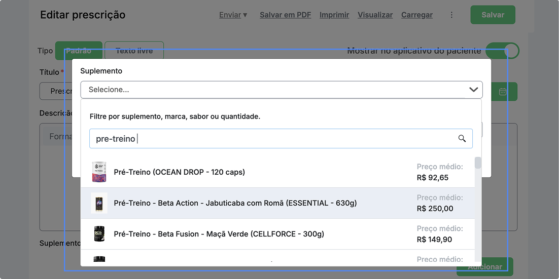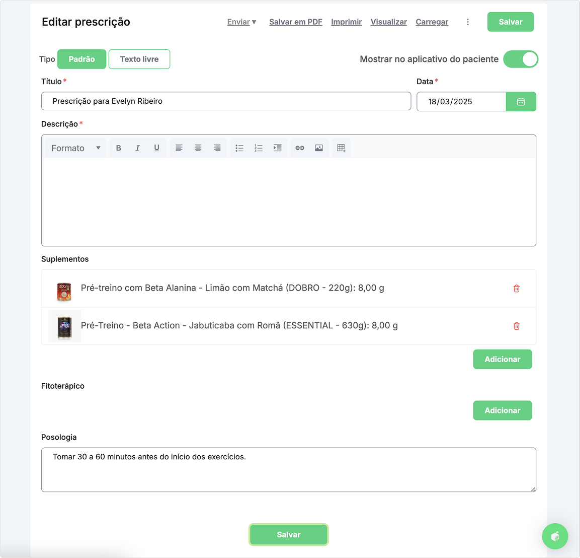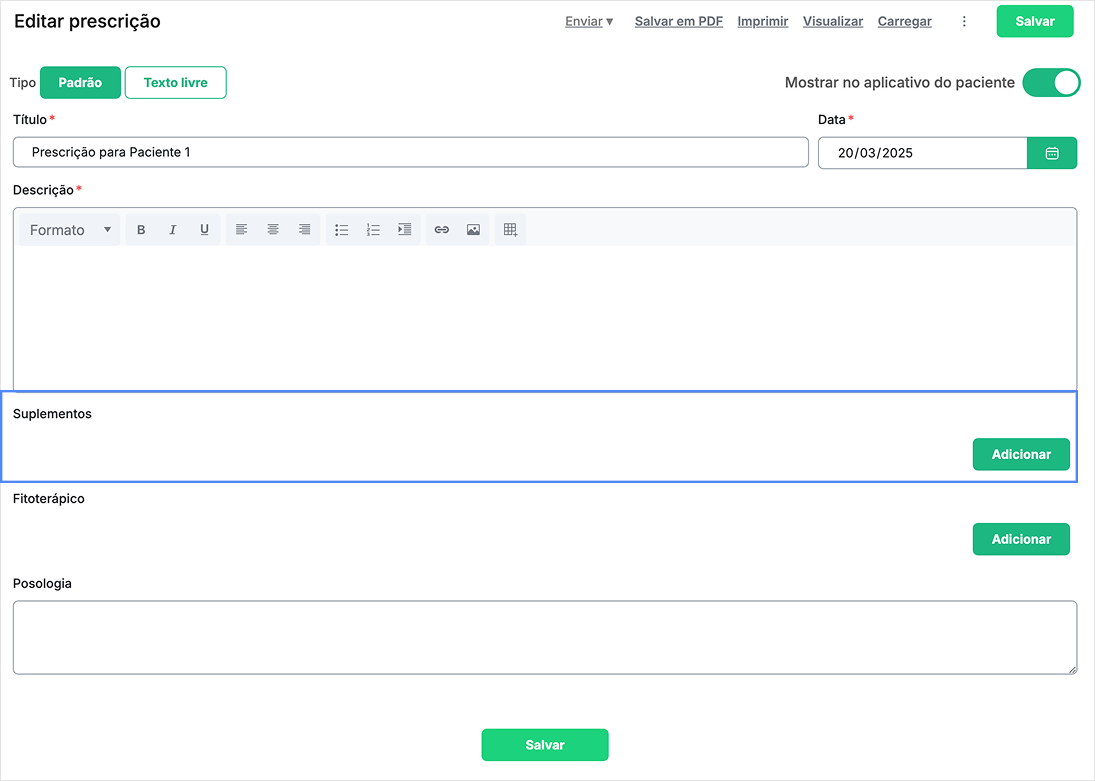 No perfil do paciente, acesse a aba Prescrições e clique em Adicionar suplemento.